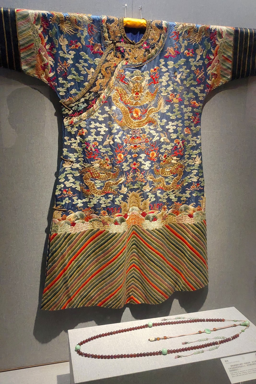 這裡所展出的文物還有這個清代時的龍袍,這應該是只有皇帝有辦法穿的衣服,通常只會出現在北京,位於華南的虎門有這件文物也是非常的特別。除了皇帝穿的龍袍,還有清代官員穿的豆彩蟒袍,這在清代都是屬於有較高身分地位的人才能穿的衣服,上面有許多作工精細的圖騰盤踞在上頭,不過這個色調看以來並不向我們在電視劇上看到的這麼鮮豔亮麗,稍微黯淡一些。