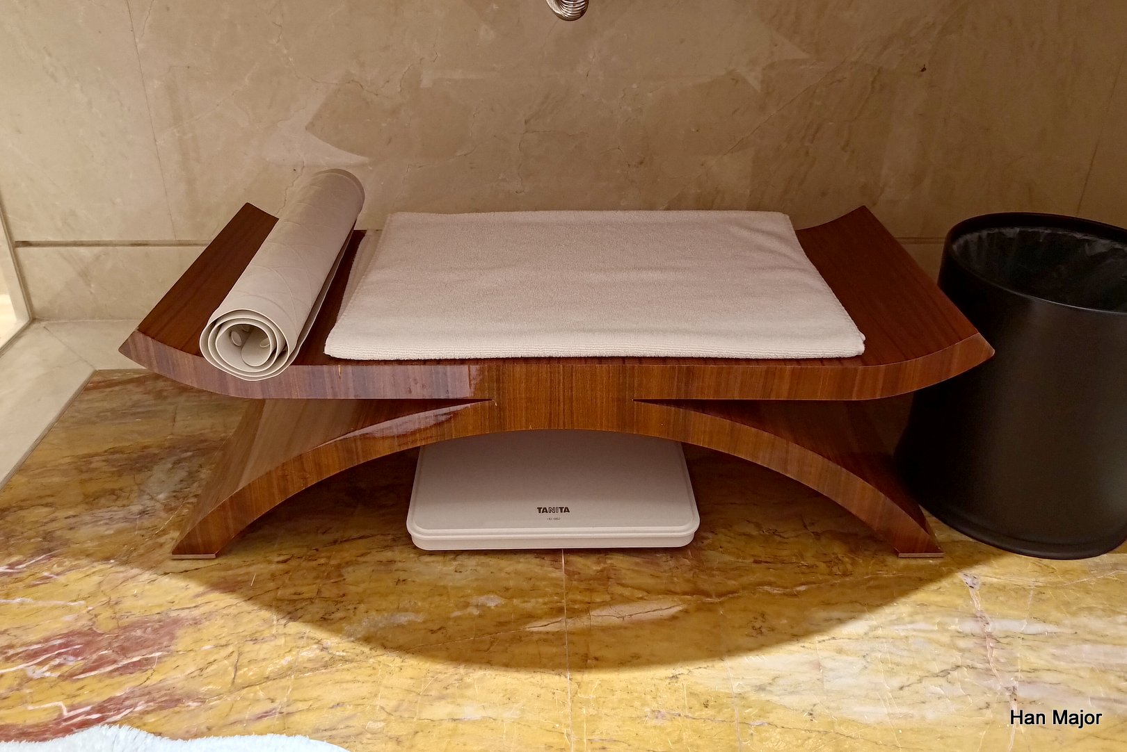 洗手台的區域有提供多種拋棄式衛生用品與吹風機、體重計等日用品。衛生用品的部分放在右手邊的小抽屜中,雙層的設計拉開後會有玲朗滿目的拋棄式用品,看起來就像是一個藏寶盒一樣。吹風機、體重計等物品就放置在檯面式洗手台下的櫥櫃中。